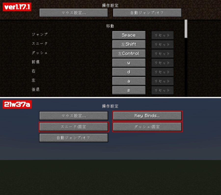 操作設定タブに「スニーク:固定」「ダッシュ:固定」のオプションボタンと「キーの割り当て」ボタンが新しく追加されました。