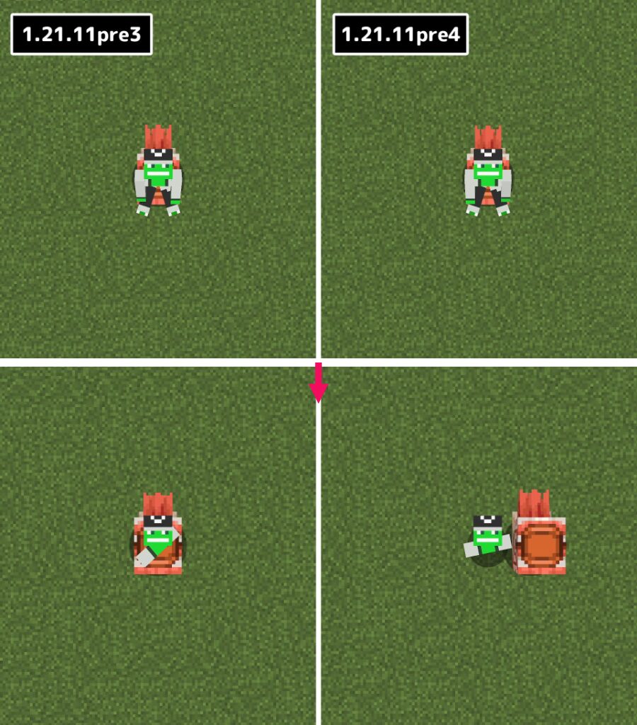 一部の状況で拡張後の範囲が4ブロック、または6ブロックになっていたクリエイティブモードでの攻撃範囲の拡張量が、再度2ブロックに統一されました。