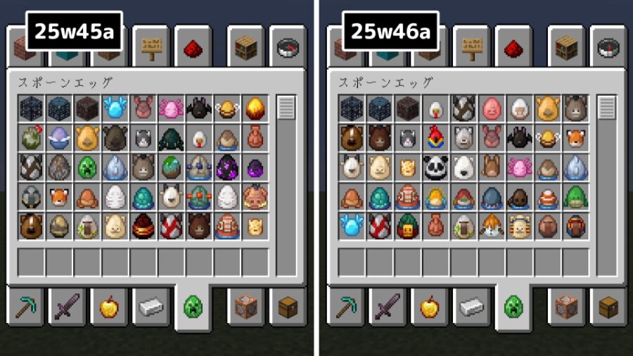 スポーンエッグの並び順がアルファベット順からオーバーワールド・ネザー・エンドのディメンション順に変更されました。