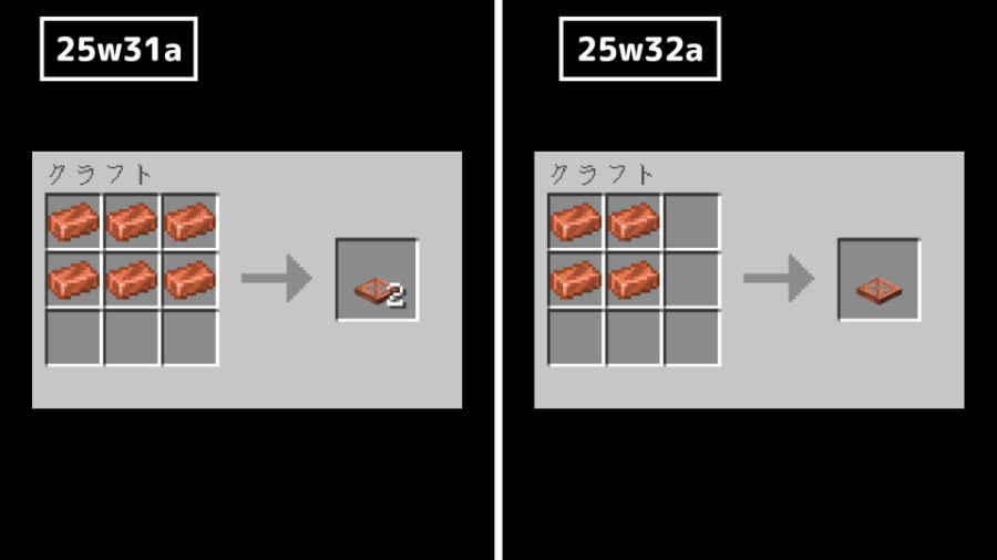 銅のトラップドアのクラフトの素材の銅のインゴットの必要数が、鉄のドアに合わせて6個から4個に変更されました。