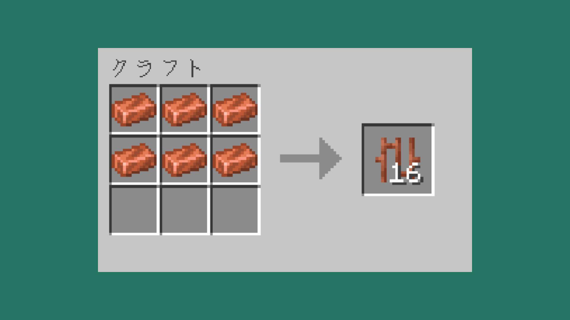 銅インゴット6個で「銅の棒」を16個クラフトすることができます。