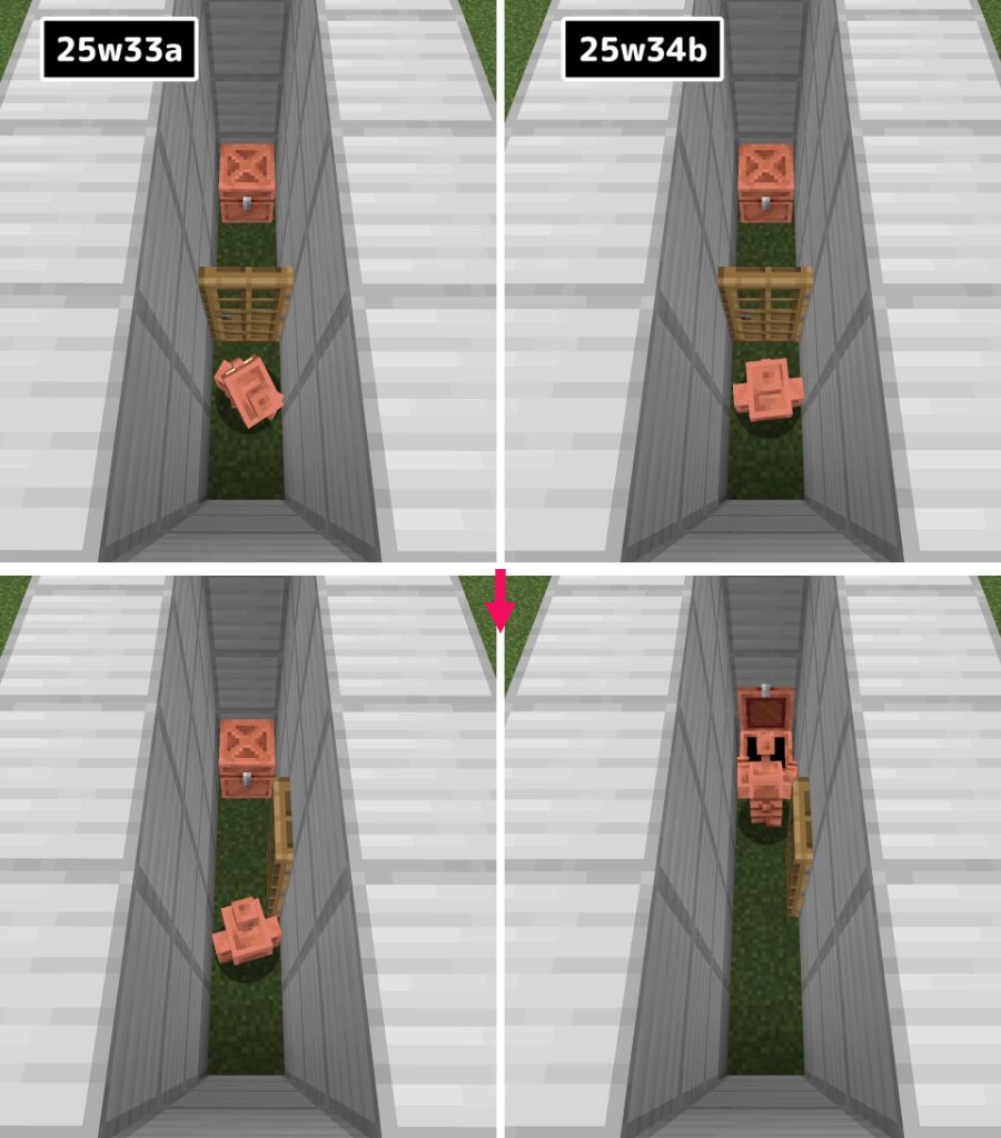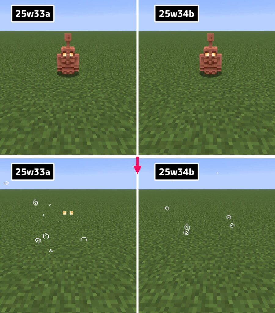 「銅のチェスト」を開いた際に再生されるサウンドと、「カッパーゴーレム」から再生されるサウンドが聴こえる範囲が16ブロックから12ブロックに縮小されました。