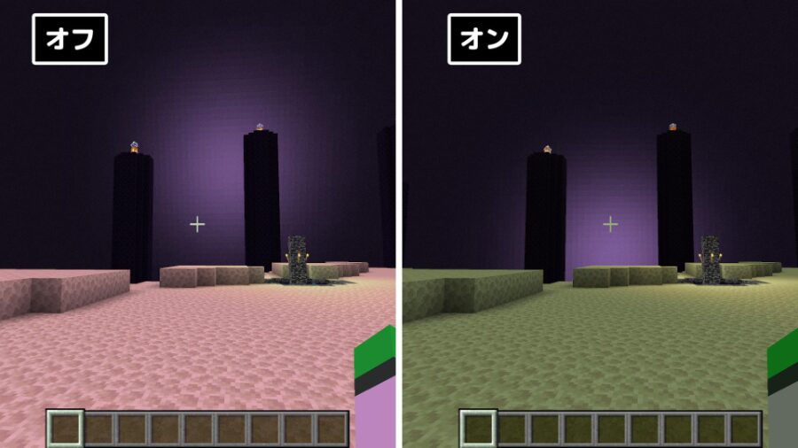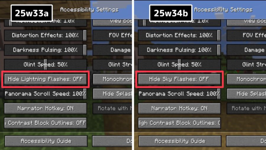 アクセシビリティ設定の「稲光の非表示」の名前が「Hide Sky Flashes」に変更され、エンドの閃光にも適用されるようになりました。