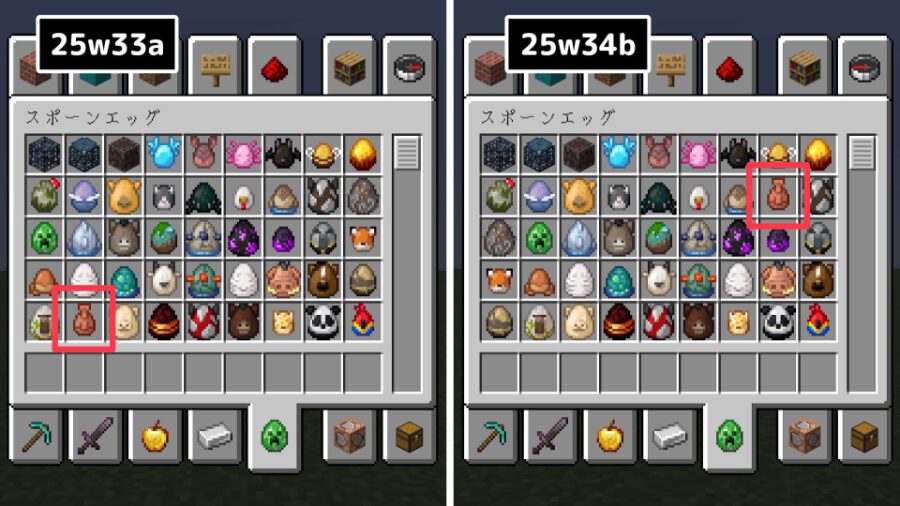 クリエイティブインベントリ内の「カッパーゴーレム」のスポーンエッグが正しい位置に移動しました。