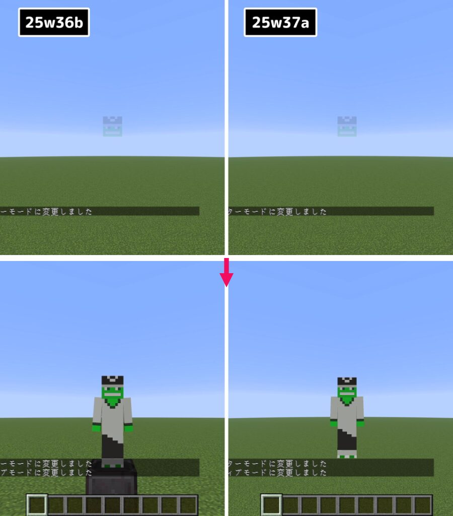 「スペクテイターモード」と「クリエイティブモード」を切り替えした際に、プレイヤーの飛行が停止しなくなりました。