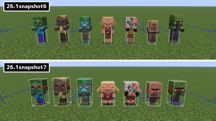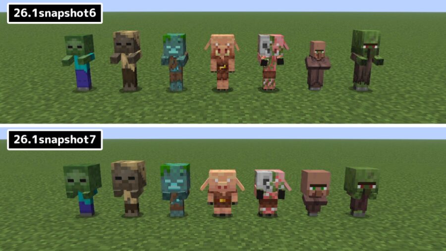 ゾンビ・ハスク・ドラウンド・ピグリン・ゾンビピグリン・村人・村人ゾンビの子供の見た目が一新されました。