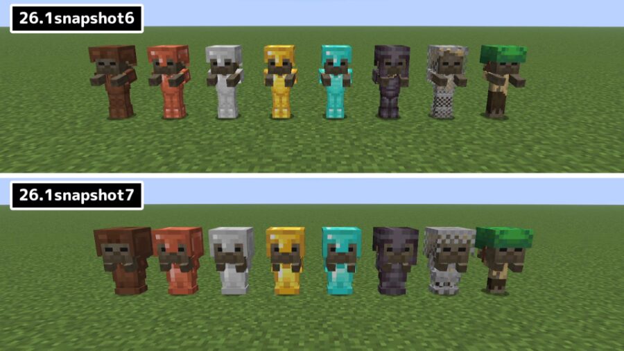 Mobの子供の見た目の変更に伴い、ゾンビ・ハスク・ドラウンド・ピグリン・ゾンビピグリン・村人・村人ゾンビの子供などが装備した際の防具のテクスチャが新しくなりました。