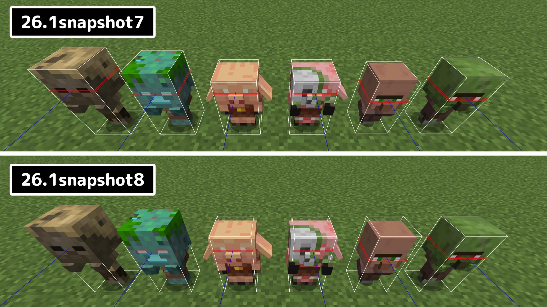 ゾンビ・ハスク・ピグリン・ゾンビピグリン・村人・村人ゾンビの子供の当たり判定が再調整されました。