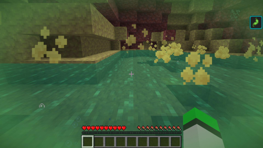 硫黄の池は黄色い液体で満たされた池で、中に入るとステータス効果「吐き気」が付与されます。