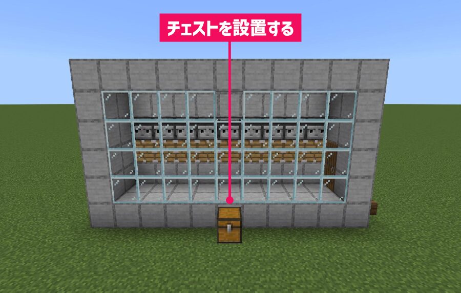 4段目の真ん中1マスを空ける形で前面にガラスの壁を「ガラス」35個で設置して