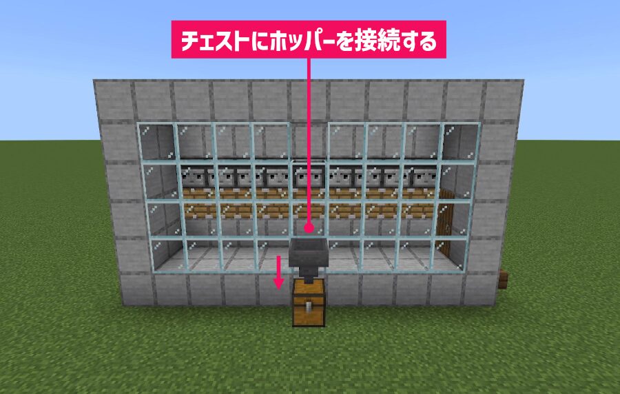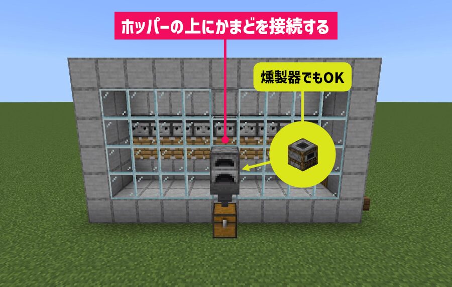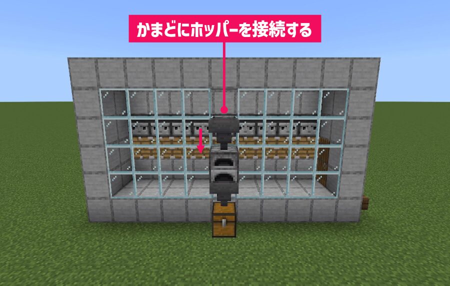 上から「ホッパー」をかまどに接続します。