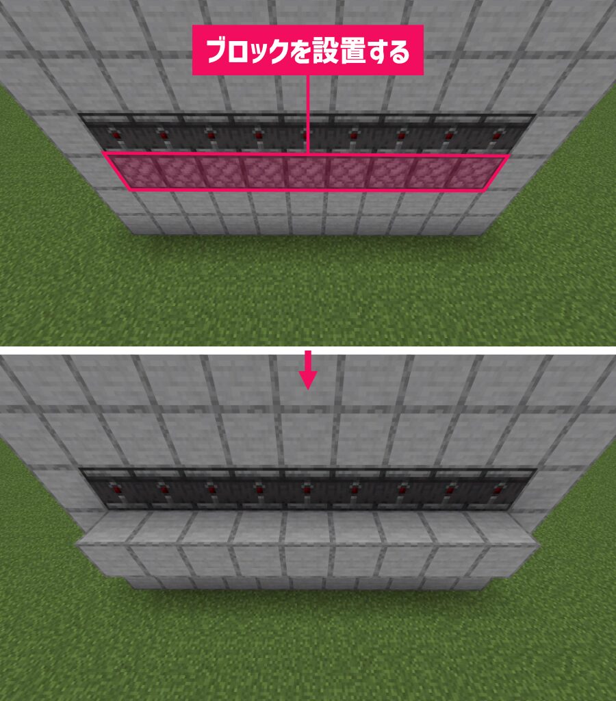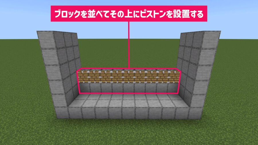 3列目に「ブロック」を横に9個並べて、その上に「ピストン」を設置します。