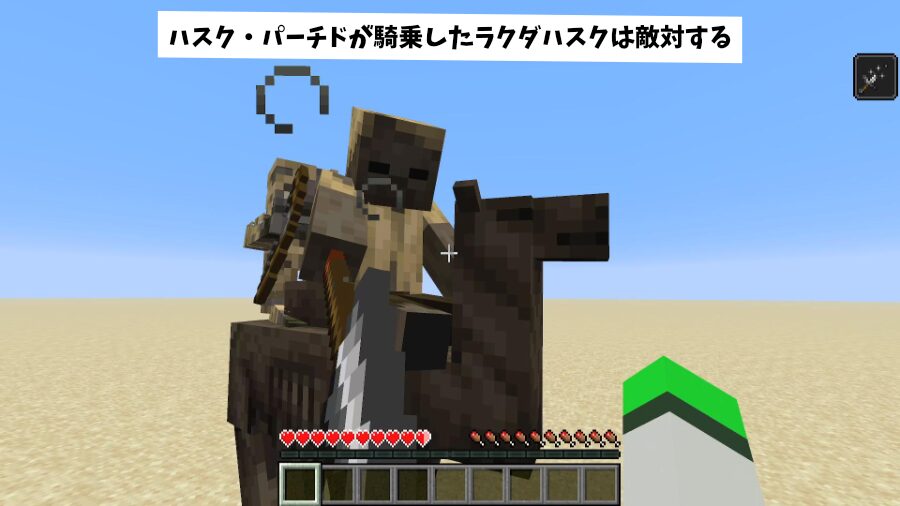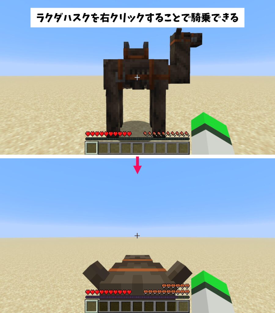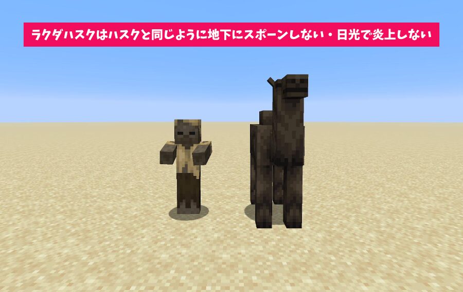 「ラクダハスク」ハスクと同じ性質なので地下にスポーンせず、日光で炎上しません。