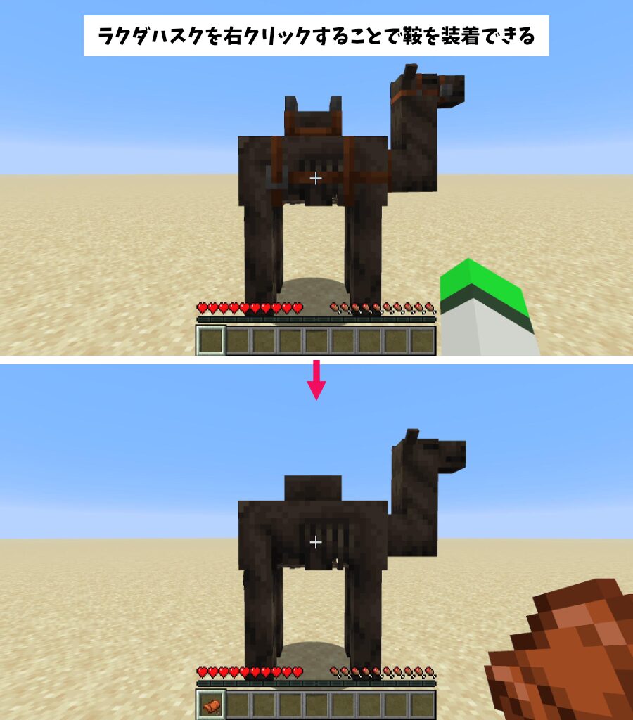 今回は、1.21.11「マウント・オブ・メイヘム」で新しく追加された「ラクダハスク」の性質・使い道を詳しく解説を詳しく解説していきたいと思います。