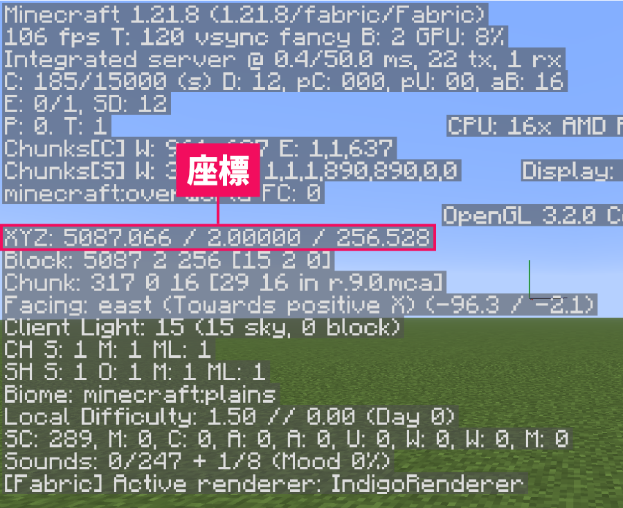 また、Java版はF3で開く「デバッグ画面」でも確認できます。