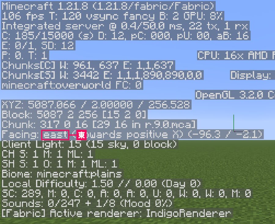 そのため、自分が向いている方向に立方体を作成したい場合は東の方角を調べる必要があります。