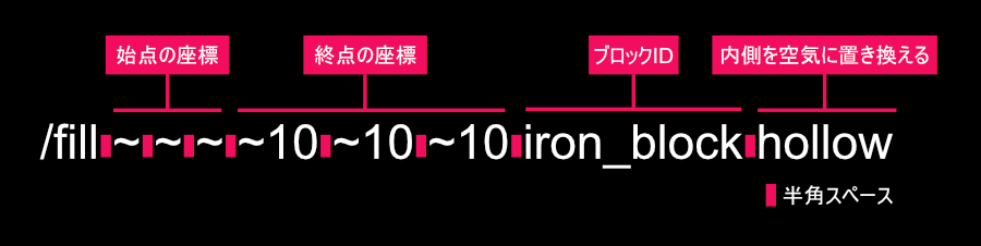 今回はコマンド「/fill」を使用して「内側が空洞の立方体を作成する」方法を解説していきたいと思います。