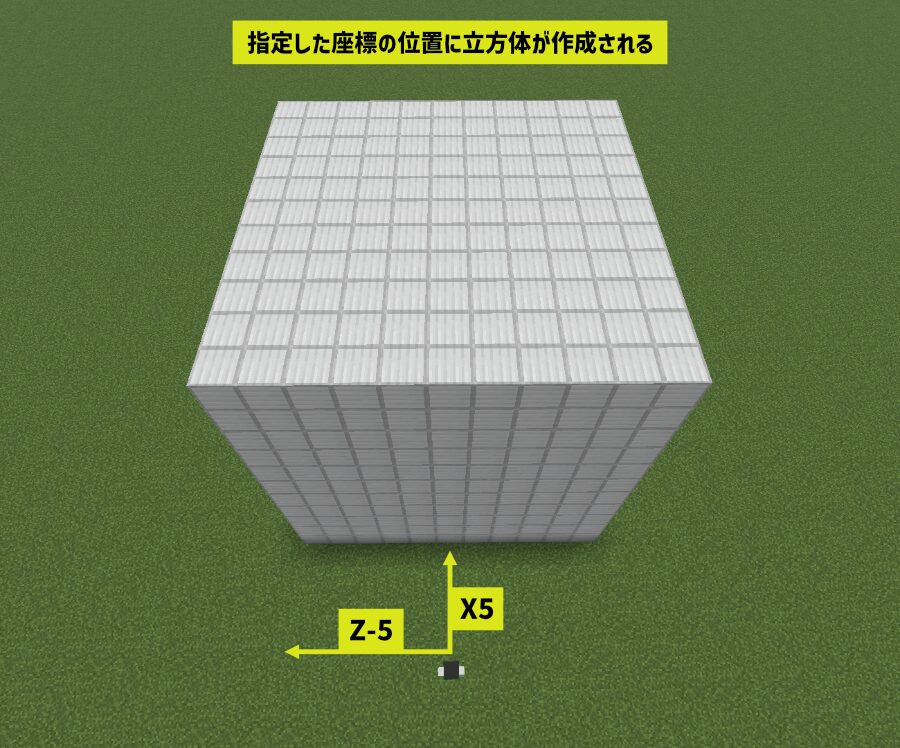 今回の例ではプレイヤーの前方に5ブロック(x5)、右に5ブロック(z-5)の位置に立方体が作成されます。