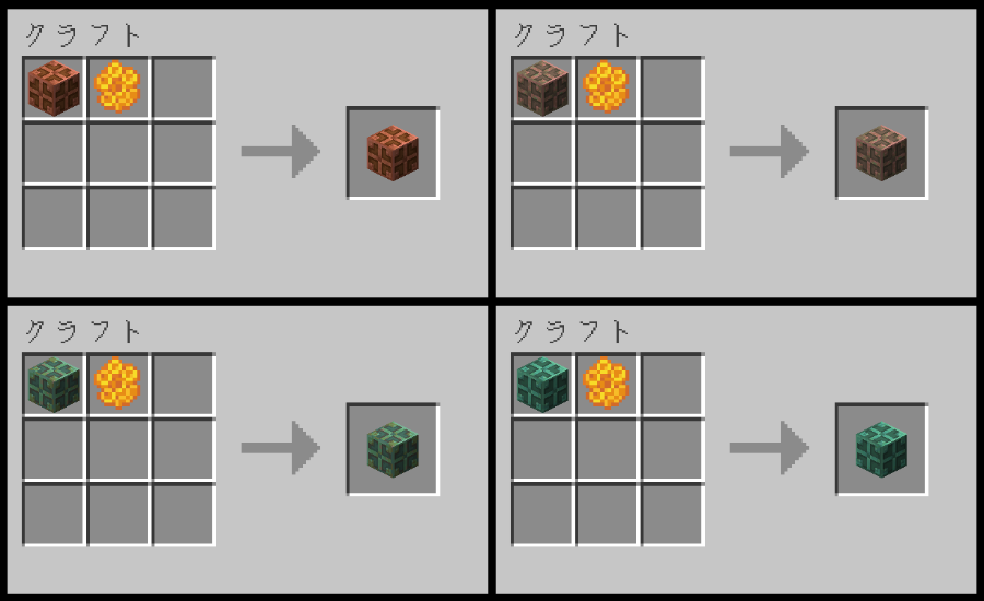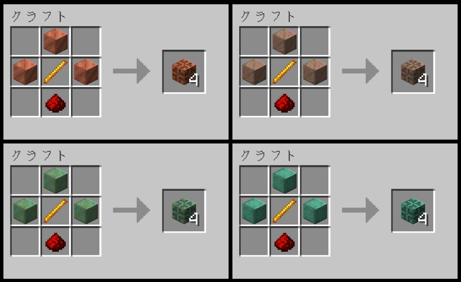 また、同じ酸化レベルの錆止めした銅ブロック3個・レッドストーンダスト1個・ブレイズロッド1個で「錆止めした銅の電球(錆止めした酸化した銅の電球)」を4個クラフトできます。