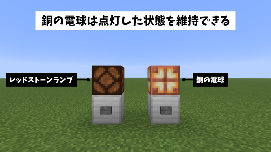 レッドストーンランプはボタンがオフになると消灯しますが、「銅の電球」はもう一度ボタンをオンにするまで点灯した状態を維持することがきます。