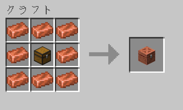 「銅のチェスト」はチェスト1個・銅のインゴット8個でクラフトできます。