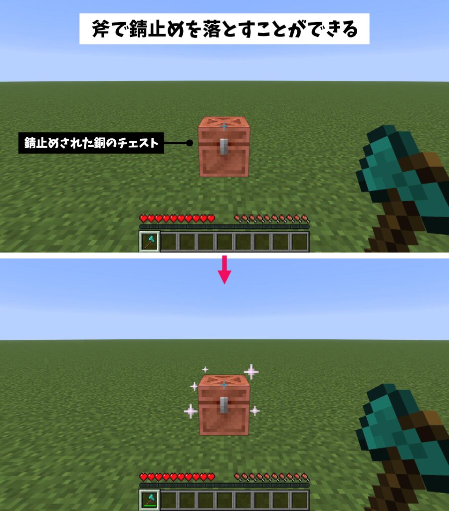 錆止めは、「錆止めされた銅のチェスト」を斧で右クリックすることで落とすことができます。