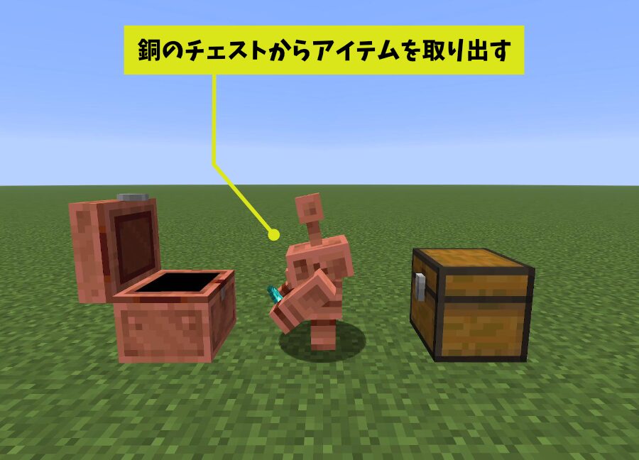 「カッパーゴーレム」は、近くに設置されている銅のチェストからアイテムを取り出して、取り出したアイテムを近くのチェスト、またはトラップチェストに保管します。