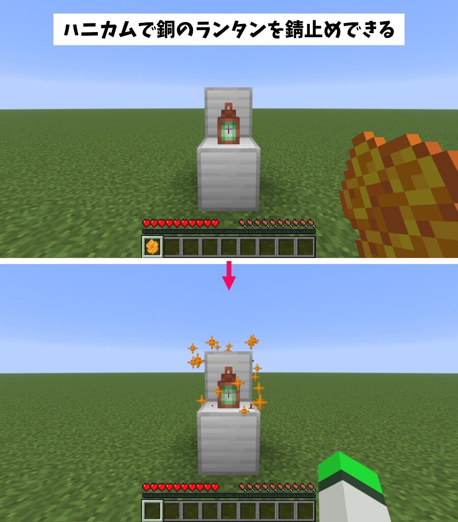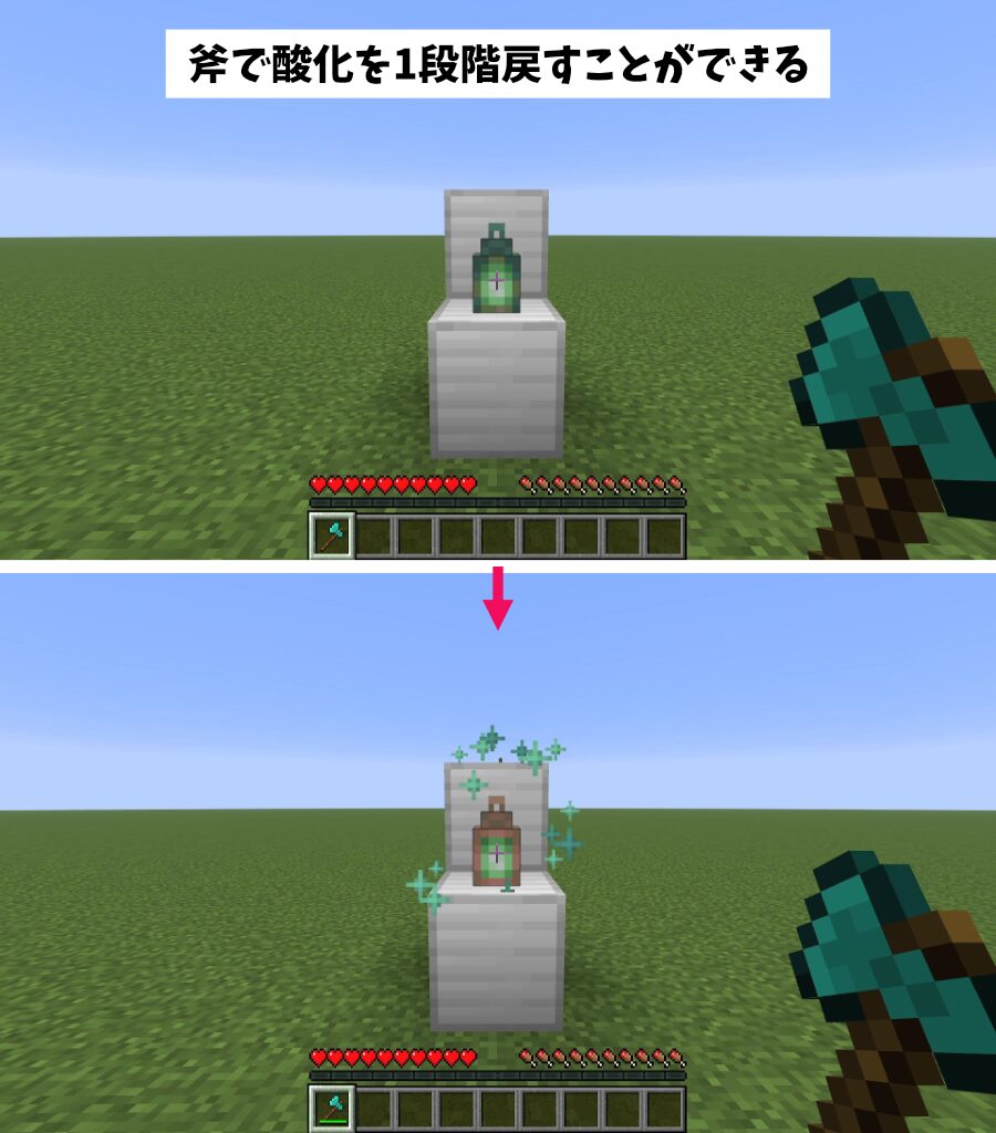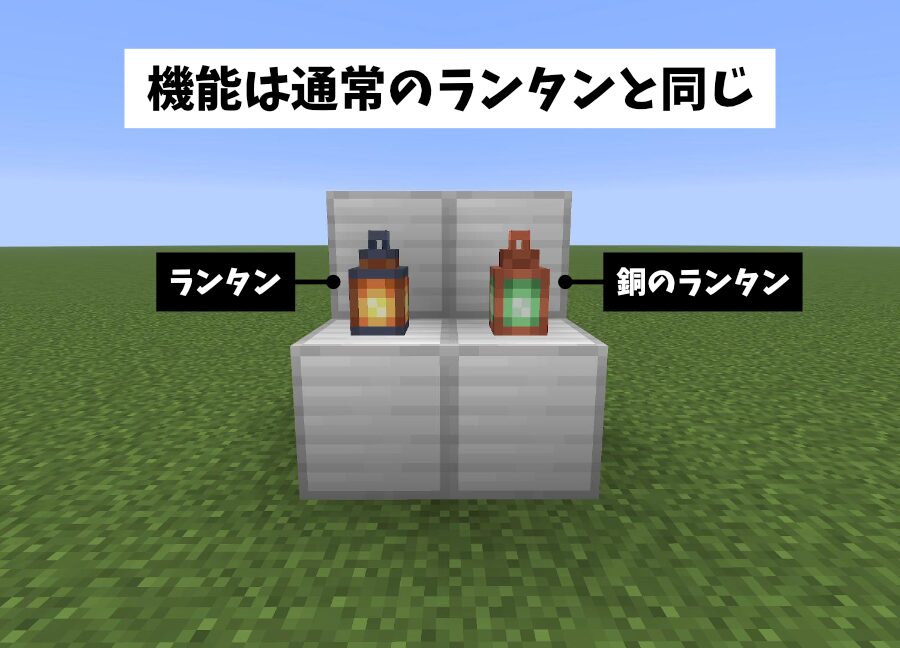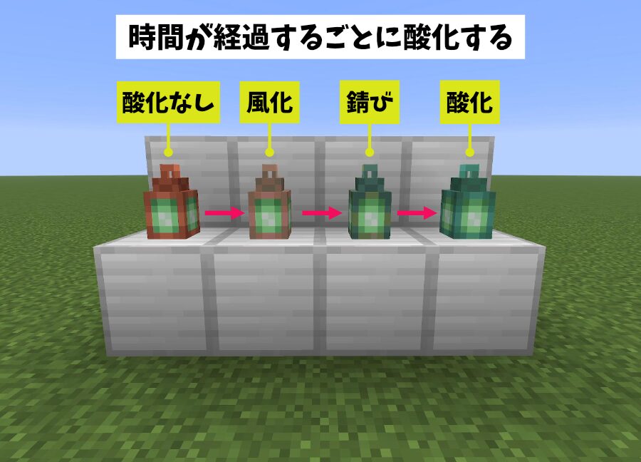 「銅のランタン」は、他の銅系ブロックと同様に酸化するため