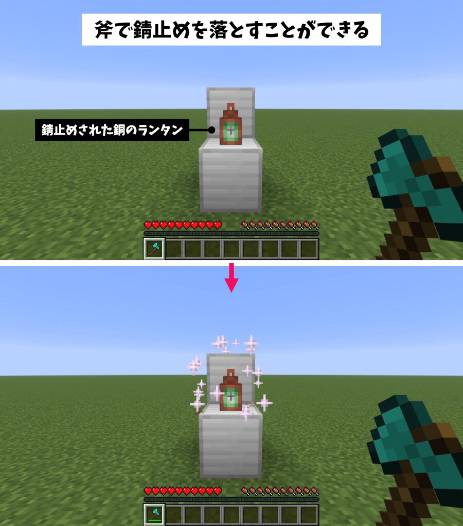 錆止めは、「錆止めされた銅のランタン」を斧で右クリックすることで落とすことができます。