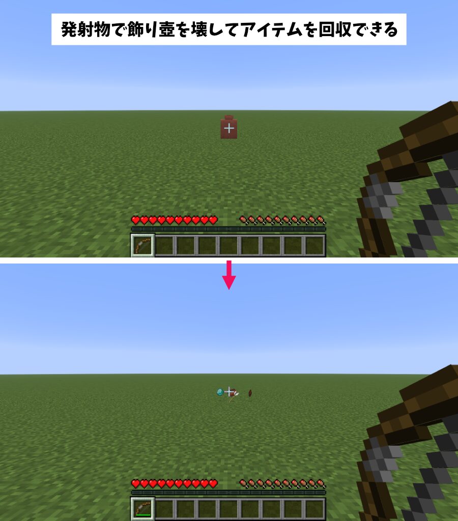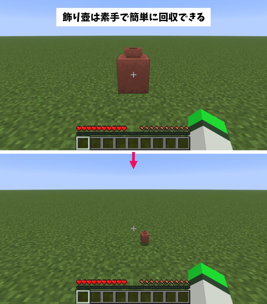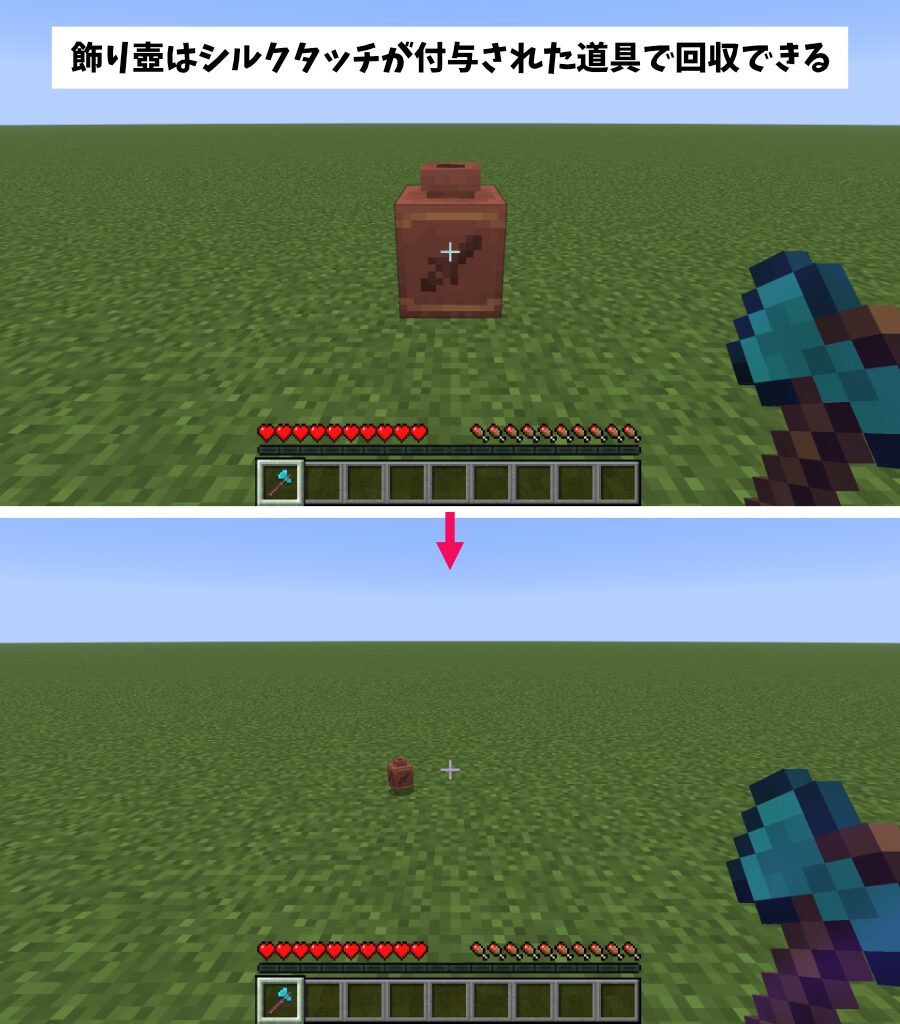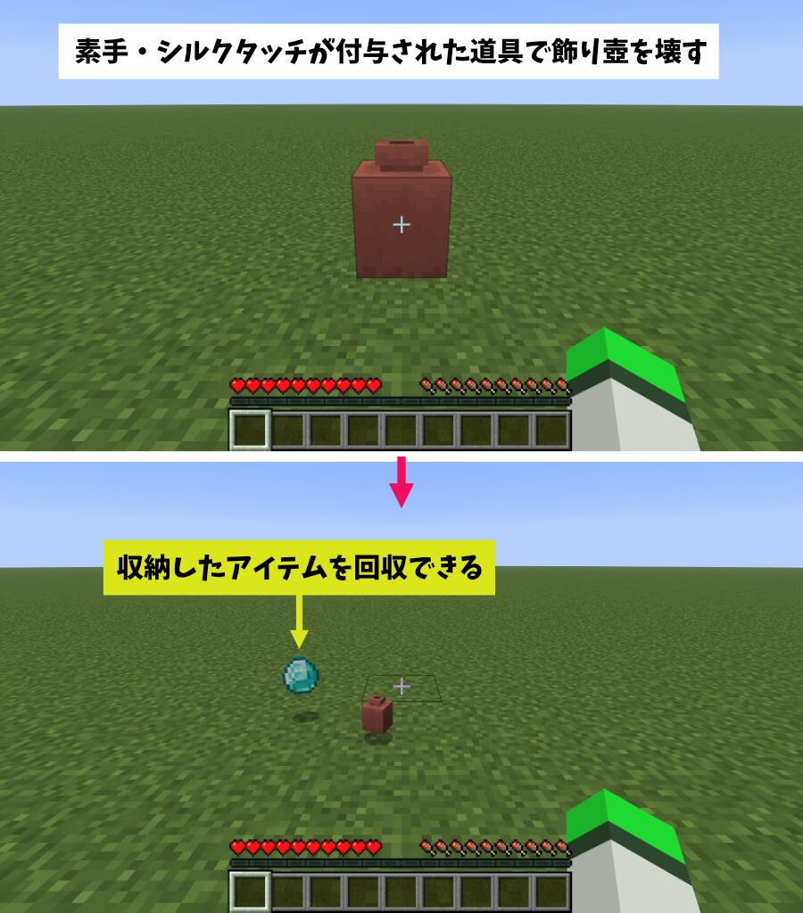 収納したアイテムは、素手・シルクタッチが付与された道具で破壊すると「飾り壺」から分離してアイテム化します。