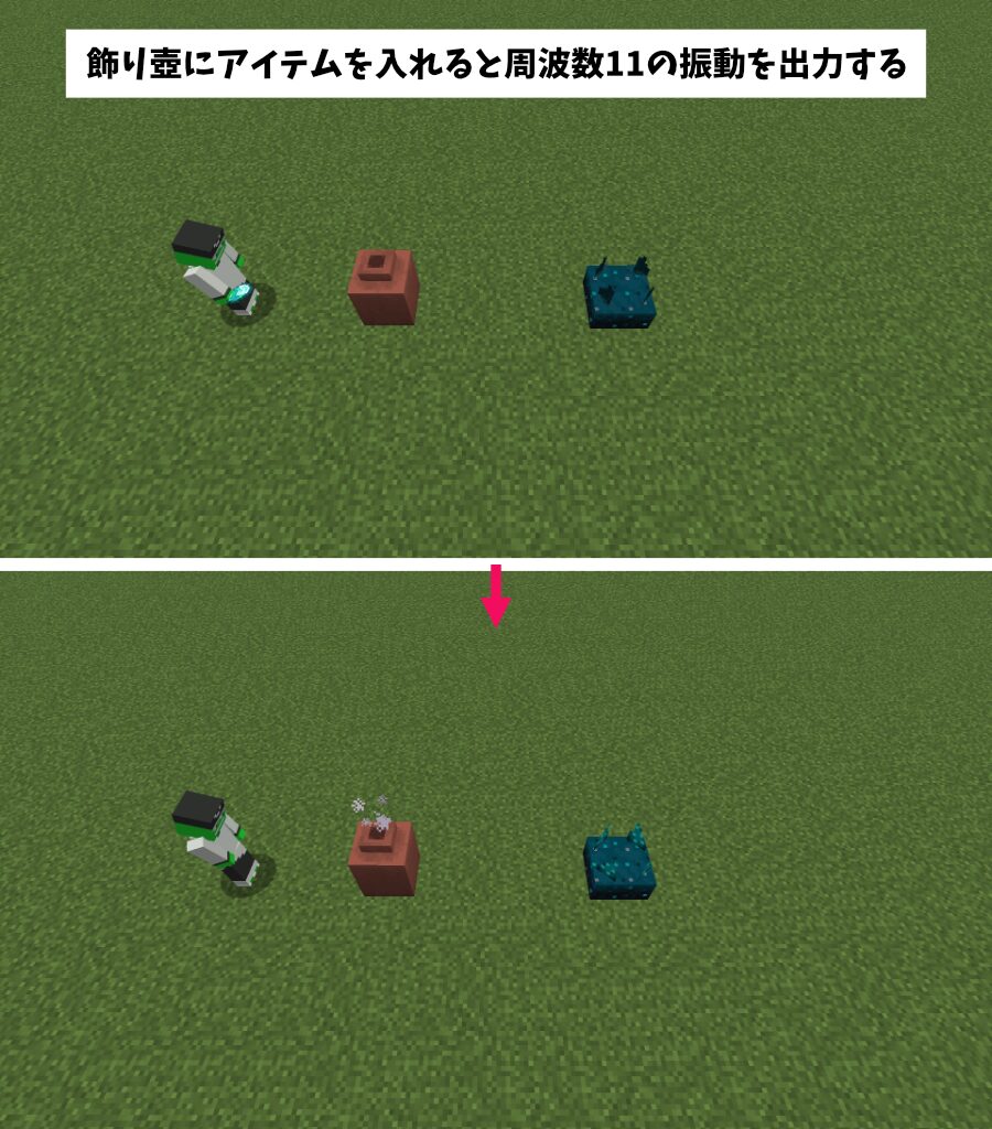 レッドストーンコンパレーターで「飾り壺」に収納されたアイテム数を読み取ることができます。