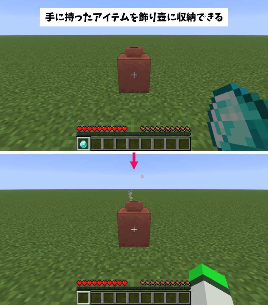 アイテムを手に持って「飾り壺」を右クリックすることでそのアイテムを収納できます。