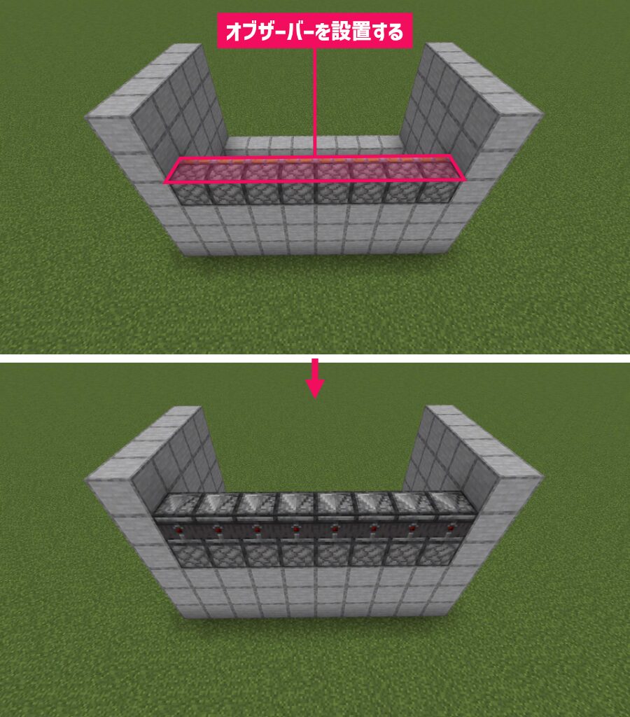 最後に後ろに回ってピストン8個の上に「オブザーバー」を設置してください。
