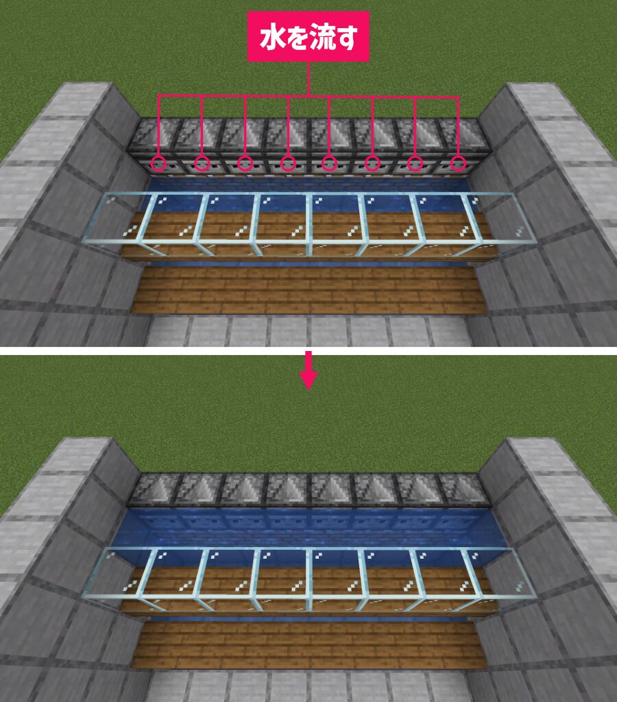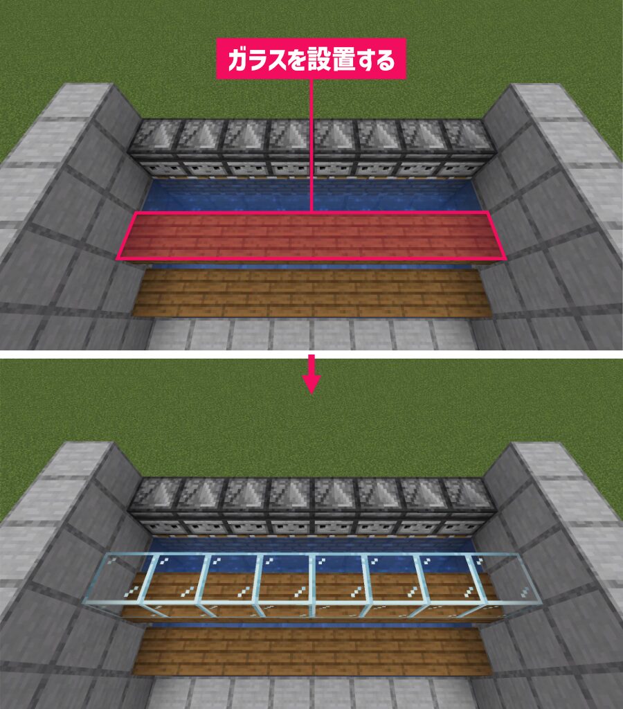 「ガラス」を手前のハーフブロックと水流の前のブロックの上に置いて