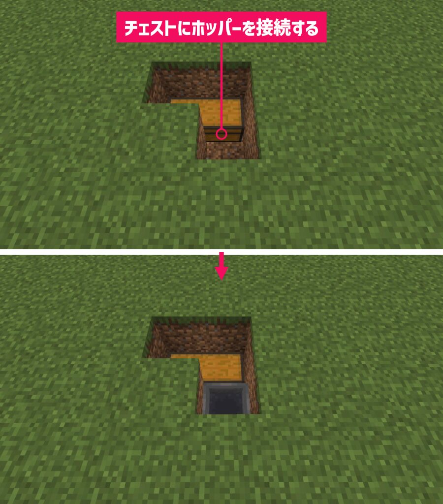 後ろに回ってラージチェストの右側に「ホッパー」を接続して