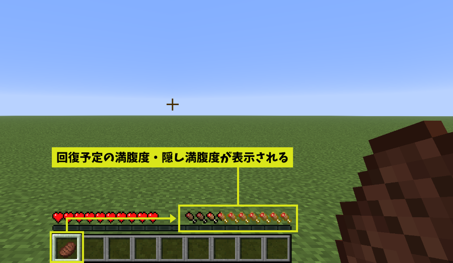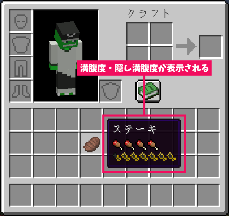 インベントリで食料にマウスを合わせると、その食料がどれだけ「満腹度」「隠し満腹度」を回復させてくれるのかが表示されます。
