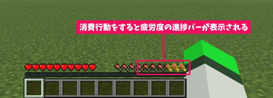 - 非回復性: この進捗バーは止まっても自然に回復することはありません。「行動した分だけ確実に空腹に近づく」というマイクラのシビアな仕様を可視化しています。