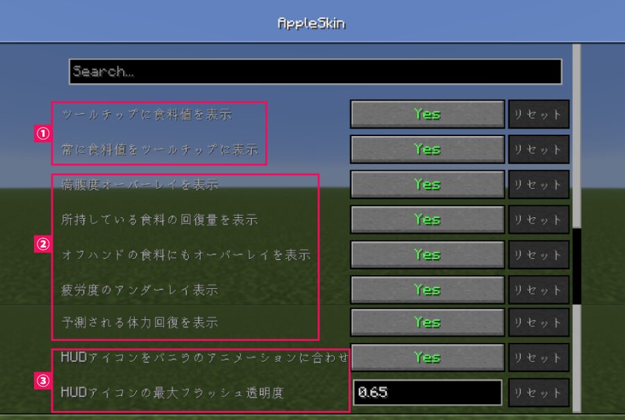 AppleSkinの設定は、大きく分けて「情報の出し方」と「見た目の調整」の2つに分類されます。
