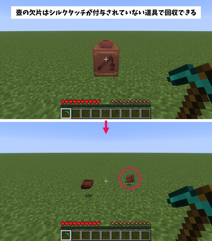 シルクタッチが付与されていないツルハシ・斧・シャベル・クワ・剣のいずれかで飾り壺を破壊すると「壺の欠片」がアイテム化します。