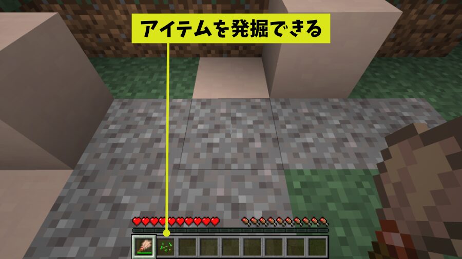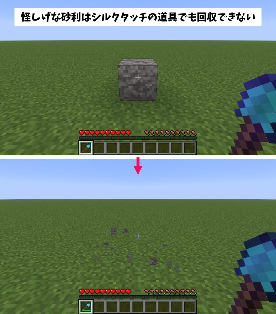 「怪しげな砂利」は非常に脆いので、シルクタッチの道具で破壊してもアイテム化しません。